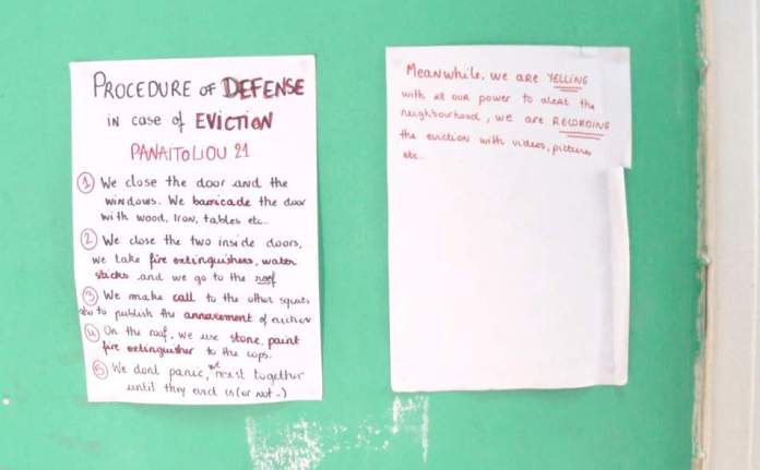 «Επισημαίνεται ακόμα ότι πίσω από τις πόρτες είχαν εγκατασταθεί ειδικοί μεταλλικοί σιδηροδοκοί για να αποτρέπουν την είσοδο ατόμων στον χώρο. Όπως θα δείτε ανάμεσα στα ευρήματα από το σύνολο των καταλήψεων, υπάρχει σημείωμα οδηγιών στα αγγλικά, που πρέπει να ακολουθηθούν από τους καταληψίες σε περίπτωση επέμβασης της αστυνομίας…