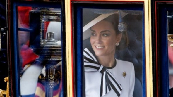Η Κέιτ, ντυμένη με ένα ανοιχτόχρωμο σύνολο, επέβαινε σε άμαξα με τα τρία παιδιά της, πριν από την ετήσια στρατιωτική παρέλαση “Trooping the Colour” κοντά στα Ανάκτορα του Μπάκιγχαμ στο κεντρικό Λονδίνο για τα επίσημα γενέθλια του Βρετανού μονάρχη, βασιλιά Καρόλου.