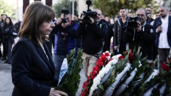 Η Πρόεδρος της Δημοκρατίας Κατερίνα Σακελλαροπούλου κατέθεσε σήμερα το πρωί στεφάνι στο μνημείο του Πολυτεχνείου, τιμώντας την 49η επέτειο της εξέγερσης των φοιτητών κατά της δικτατορίας των συνταγματαρχών.