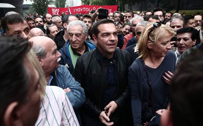 Με ανάλογη αμφίεση ο πρώην πρωθυπουργός βρίσκεται στην πρώτη γραμμή του μπλοκ του ΣΥΡΙΖΑ σε «αλυσίδα» με τον πρώην πρόεδρο της Βουλής Νίκο Βούτση, τον γραμματέα του κόμματος Πάνο Σκουρλέτη, την πρώην περιφερειάχη Αττικής Ρένα Δούρου και άλλα στελέχη του κόμματος.