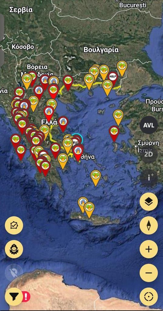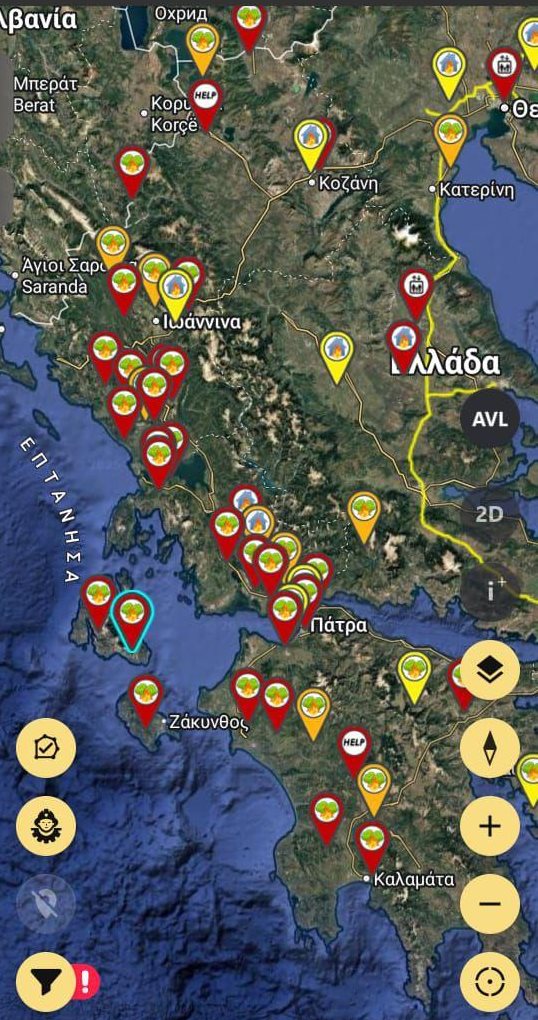 Η επιχειρησιακή εικόνα με γεωγραφικό προσδιορισμό των πυρκαγιών σε όλη την Ελλάδα, τα μέσα και το προσωπικό, αποτυπώνονται σε χάρτες του υπουργείου Κλιματικής Κρίσης και Πολιτικής Προστασίας. Με κόκκινο είναι οι πυρκαγιές σε εξέλιξη, ενώ οι υπόλοιπες είναι υπό μερικό έλεγχο, που σημαίνει ότι υπισχνούνται (σ.σ. δεσμεύονται) ακόμα δυνάμεις.