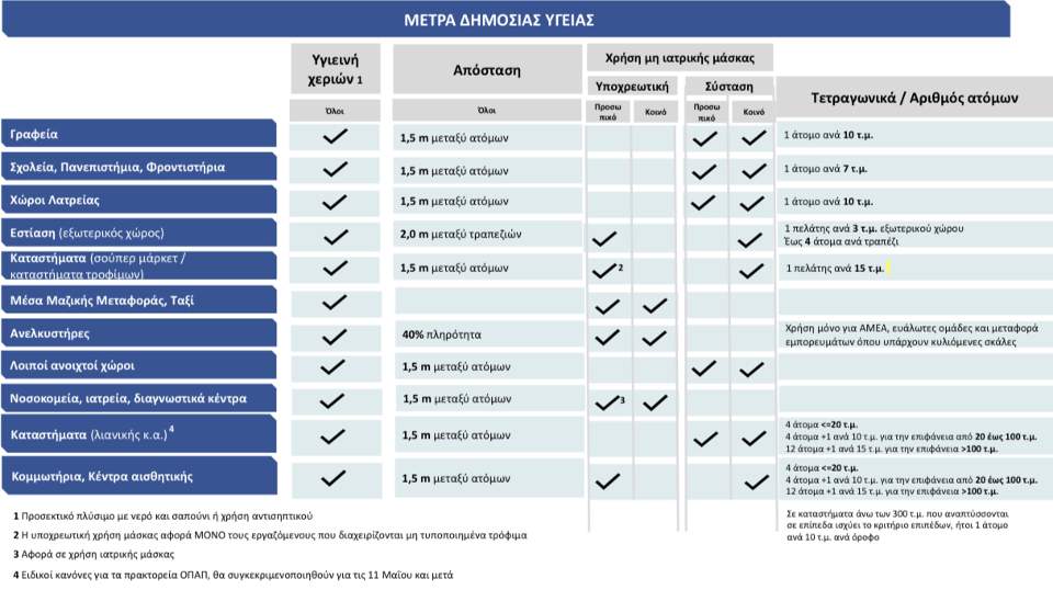 Αναλυτικά αναφέρονται οι προβλέψεις για γραφεία, σχολεία, πανεπιστήμια και φροντιστήρια, χώρους λατρείας – εκκλησίες, εστίαση, καταστήματα τροφίμων και σούπερ μάρκετ, μέσα μαζικής μεταφοράς, ταξί, ανελκυστήρες, νοσοκομεία, ιατρεία, καταστήματα λιανικής, κομμωτήρια, κέντρα αισθητικής κ.α.