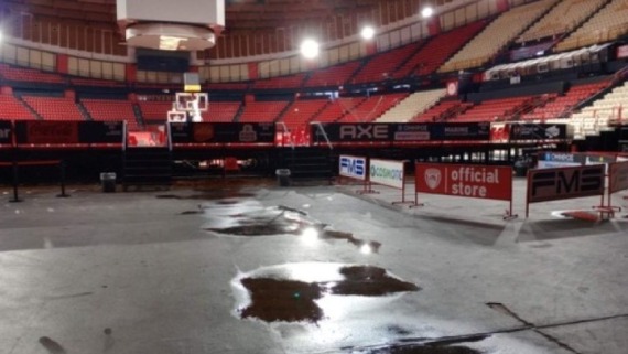 Σημειώνεται, ότι η οροφή του ΣΕΦ στάζει σε αρκετά σημεία, ενώ άνθρωποι των «ερυθρόλευκων» επιχειρούν προκειμένου να βελτιώσουν την κατάσταση και στην συνέχεια όταν απομακρυνθούν τα σωρευμένα ύδατα, να γίνει μία πρώτη εκτίμηση των ζημιών.