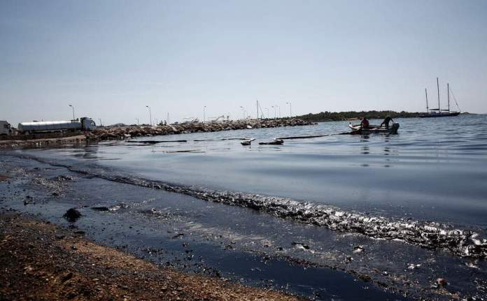Μπροστά από την περιοχή της Σχολής Ναυτικών Δοκίμων παραμένει πλωτό φράγμα, ενώ συνεχίζονται οι εργασίες καθαρισμού από ξηράς με απορροφητικά υλικά.