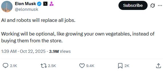 «Η τεχνητή νοημοσύνη και τα ρομπότ θα αντικαταστήσουν όλες τις θέσεις εργασίας. Η εργασία θα είναι προαιρετική, όπως η καλλιέργεια των δικών σας λαχανικών, αντί να τα αγοράζετε από το κατάστημα».