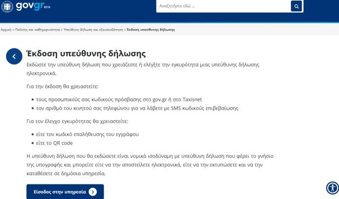 Υπεύθυνες δηλώσεις θα μπορούν πλέον να γίνονται από το κινητό ή τον υπολογιστή μας, χωρίς μετακινήσεις και περιττή γραφειοκρατία, καθώς τέθηκε σε δοκιμαστική λειτουργία η ενιαία ψηφιακή πύλη του Δημοσίου που υλοποιεί το υπουργείο Ψηφιακής Διακυβέρνησης gov.gr. Η ενεργοποίηση της πλατφόρμας επισπεύσθηκε κατά 2 μήνες λόγω των έκτακτων συνθηκών., και περιλαμβάνει μια σειρά από διαδικασίες που έως τώρα απαιτούσαν αυτοπρόσωπη παρουσία σε ΚΕΠ ή αστυνομικό τμήμα. Μπορείτε να εκδώσετε την υπεύθυνη δήλωση που χρειάζεστε ή να ελέγξτε την εγκυρότητα μιας υπεύθυνης δήλωσης ηλεκτρονικά, επιλέγοντας το link (σύνδεσμο) στο τέλος του άρθρου.