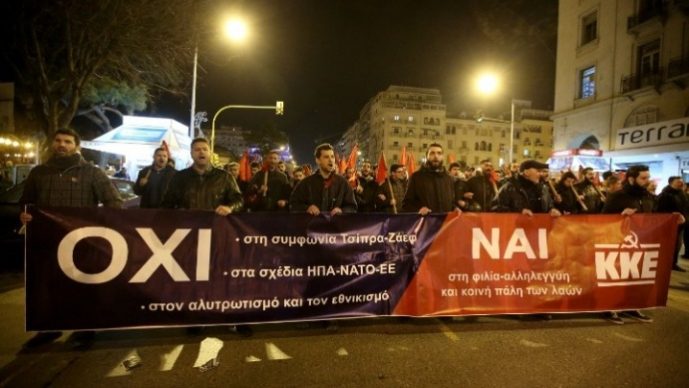 Συλλαλητήριο κατά της Συμφωνίας των Πρεσπών διοργάνωσε απόψε, στο άγαλμα του Βενιζελου στη Θεσσαλονίκη, η Κομματική Οργάνωση Κεντρικής Μακεδονίας του ΚΚΕ. “Όχι στη Συμφωνία Τσίπρα – Ζάεφ, Όχι στα σχέδια ΗΠΑ – ΝΑΤΟ – ΕΕ. Όχι στον αλυτρωτισμό και στον εθνικισμό. Ναι στη φιλία, την αλληλεγγύη και κοινή πάλη των λαών”, είπε στην ομιλία του ο ευρωβουλευτής του ΚΚΕ, Σωτήρης Ζαριανόπουλος, αναφέροντας τα συνθήματα της συγκέντρωσης. Ο κ. Ζαριανόπουλος, εξήγησε τη θέση του ΚΚΕ και έβαλε κατά των “αστικών κομμάτων” για τη στάση τους απέναντι στη Συμφωνία των Πρεσπών.